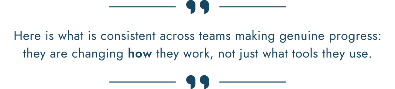Here is what is consistent across teams making genuine progress: they are changing how they work, not just what tools they use.
