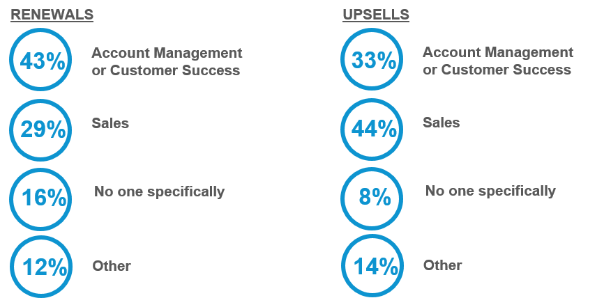 Responsibility for upsells and renewals varies. Renewals are most often handled by